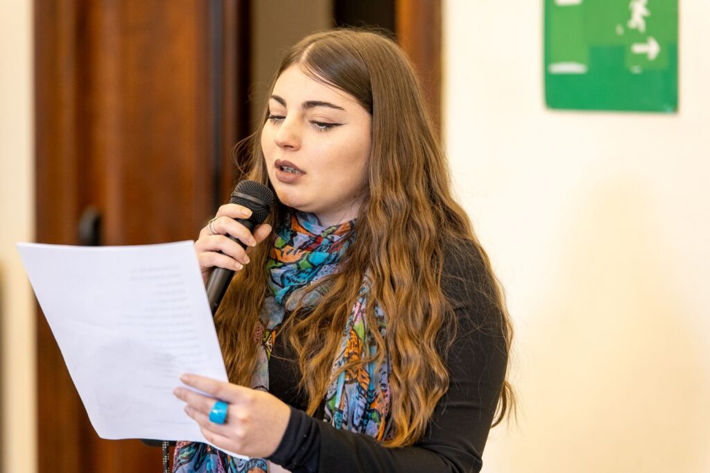Prende la parola la  conduttrice  Nicole Lanzano, coadiuvata nelle traduzioni di inglese e tedesco dall’interprete Luigia Tessitore per dare inizio all’evento. Si comincia con la presentazione dell’attrice professionista Eleonora Mancini la quale, prima di essere premiata, regala una emozionante performance, interpretando un suo monologo dal titolo “l’arte di resistere”.